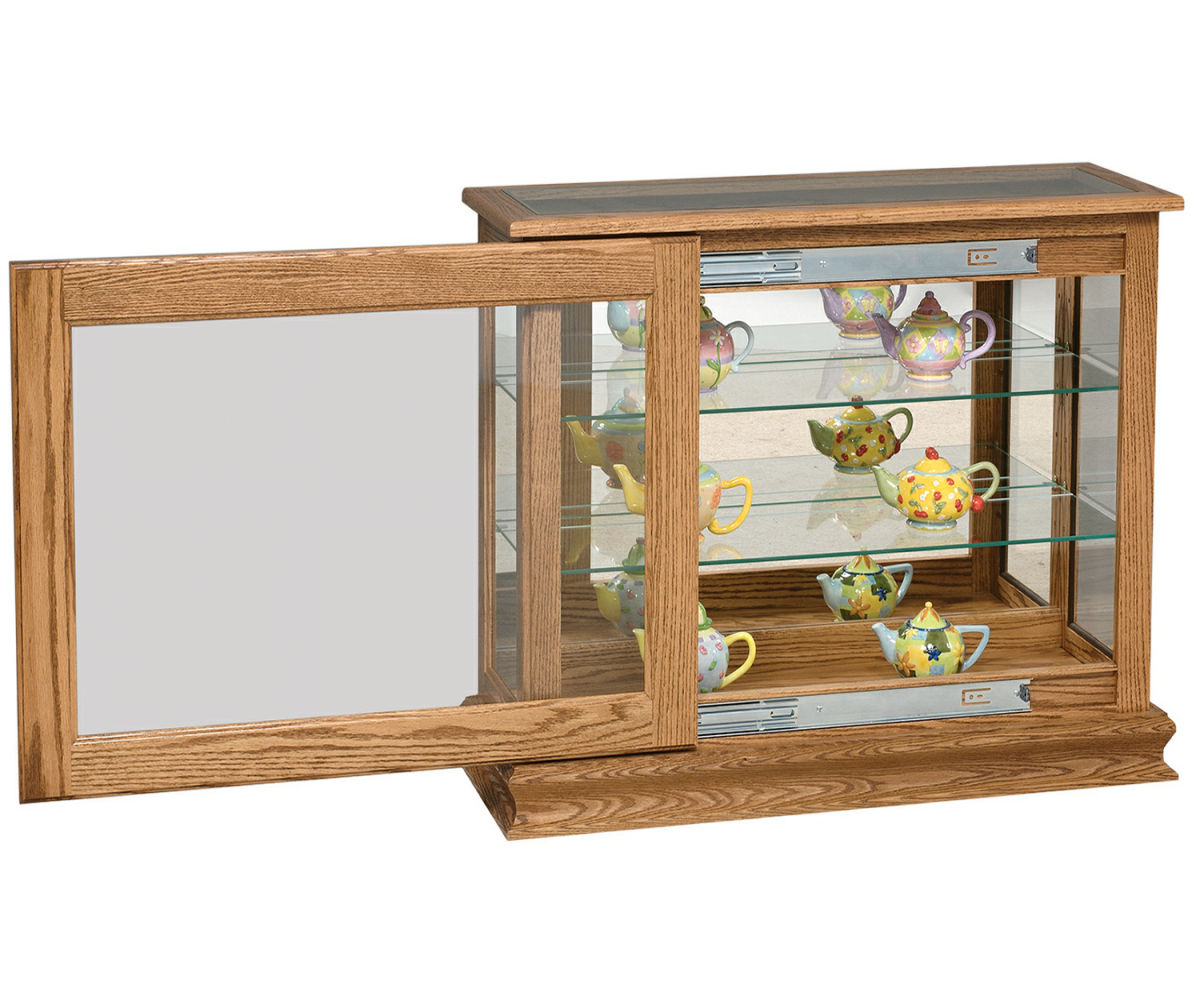 Features: • Glass top • Mirror back • Two adjustable glass shelves with plate groove • Door slides left